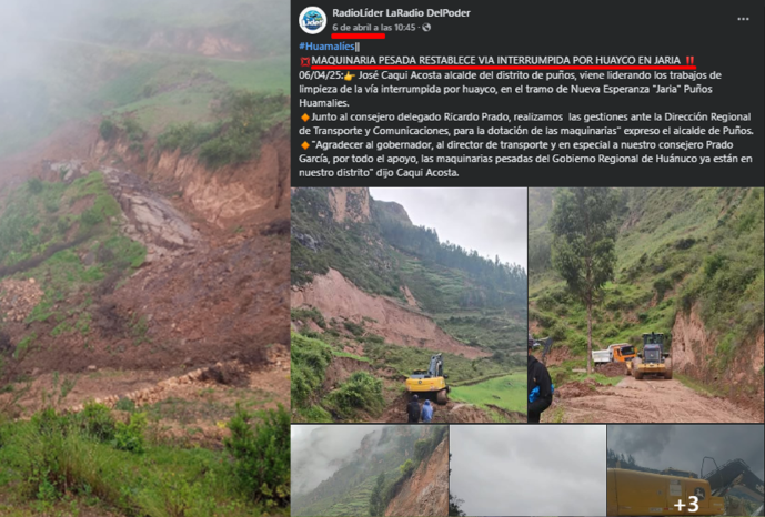 6 de abril: “MAQUINARIA PESADA RESTABLECE VIA INTERRUMPIDA POR HUAYCO EN JARIA”,